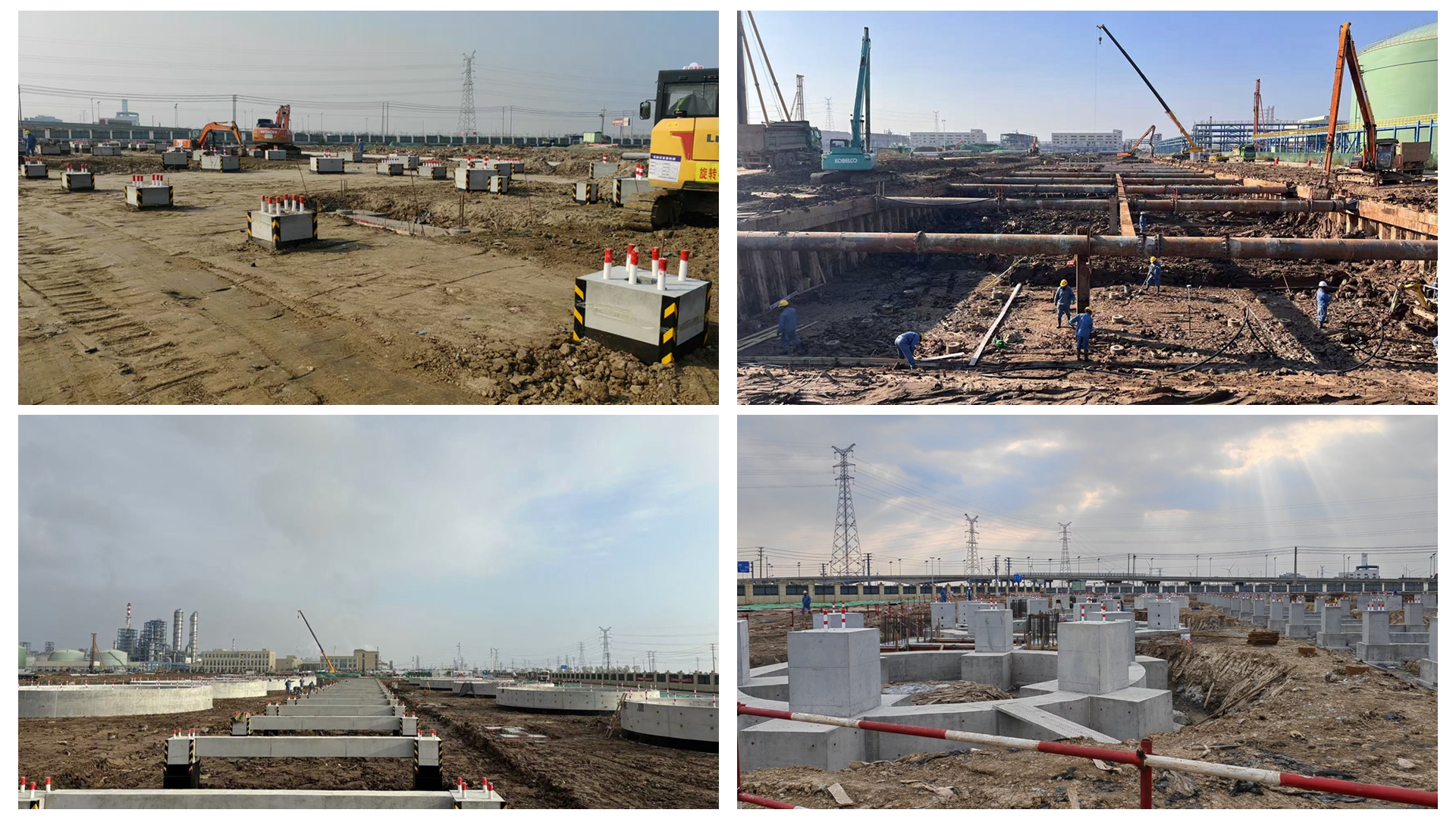 在罐區(qū)施工中,部分構(gòu)筑物結(jié)構(gòu)形式復(fù)雜,項(xiàng)目部連續(xù)克服深基坑支護(hù)、大體積混凝土澆筑、高支模相關(guān)的支撐架搭設(shè)、池類構(gòu)筑物及冷卻水塔的防滲抗漏、大面積地坪的找平澆搗等多項(xiàng)施工難題,實(shí)現(xiàn)了施工進(jìn)度快速平穩(wěn)推進(jìn)。