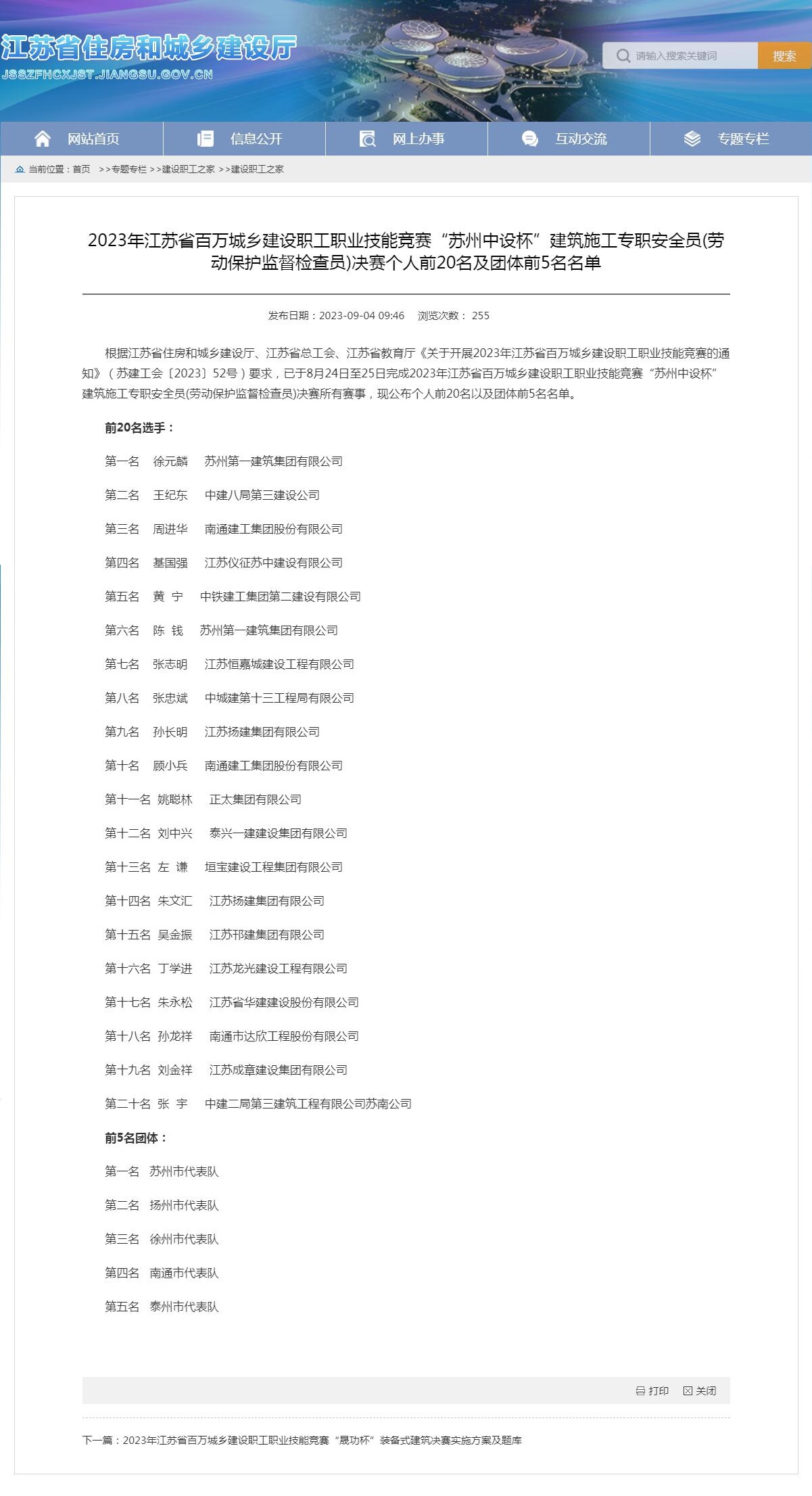 我司基國強同志于8月24日至25日參加由江蘇省住房和城鄉(xiāng)建設廳、江蘇省總工會、江蘇省教育廳聯(lián)合舉行的2023年江蘇省百萬城鄉(xiāng)建設職工職業(yè)技能競賽“蘇州中設杯”建筑施工專職安全員(勞動保護監(jiān)督檢查員)決賽中,取得第四名的優(yōu)異成績,并獲得“省住房城鄉(xiāng)建設系統(tǒng)技能標兵”稱號!特此祝賀!